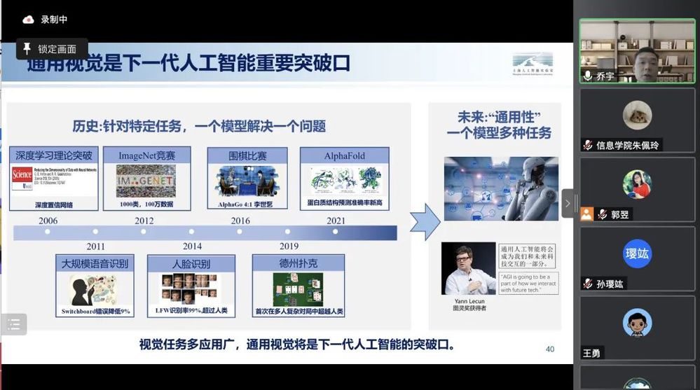 乔宇还为大家介绍了自己团队的研究方向——通用视觉。他指出,通用智能是国际科技竞争的焦点,通用视觉是下一代人工智能重要突破口,要面向经济主战场,降低研发成本,变革AI赋能百行千业,即降低成本红线;要面向国家重大需求,提升认知和泛化能力,应对重难点领域,即突破认知红线。他详细介绍了团队研发的国内首个广泛覆盖多种视觉任务的通用大模型“书生”,包括“书生”的通用图像模型、国际领先的性能、面临的挑战和困难等。