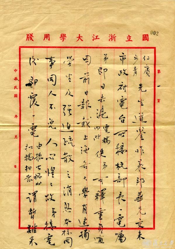 竺可桢致应变委员会正副主席严仁赓、苏步青教授函(浙江大学档案馆提供)