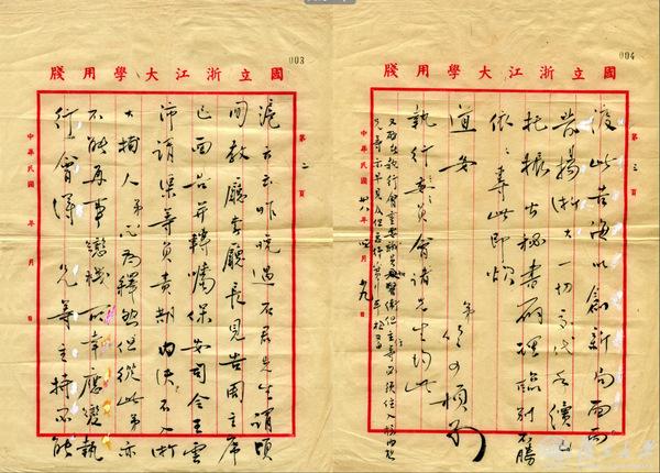 展览中还可以看到时任浙大校长竺可桢写给严仁赓、苏步青两人的亲笔信。这封信有三页,由竺可桢本人用毛笔书写,落款时间是1949年4月29日。当时竺可桢已离开浙大,他在信中将管理浙大的事务托付给严、苏两人领导的应变委员会(二人分别为该委员会的正副主席)。