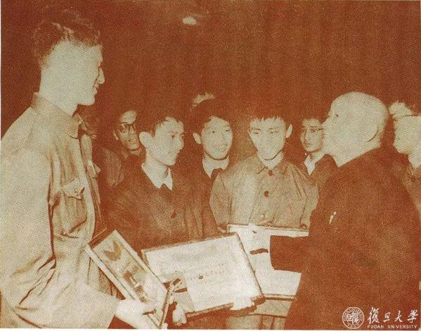 1978年苏步青在上海市数学竞赛颁奖大会上为第一名获得者李骏(左一)发奖