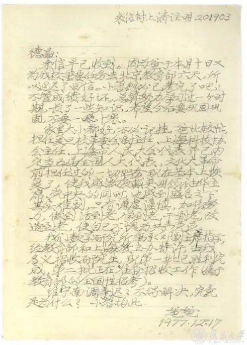 在苏步青的提议下,1977年,教育部专门发文招收研究生。1977年12月17日苏步青给女儿苏德晶的信中谈到,复旦大学数学研究所经教育部和上海教卫办特许开始招收研究生。1983年全国首批18位博士毕业生中,有4位是复旦数学培养。