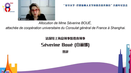 法国驻上海总领事馆教育领事Séverine BOUÉ(白丽娜)在致辞中首先表达了自己得以参与“复旦大学-巴黎高师人文学科联合培养项目”八周年纪念活动的荣幸,认为这是中法两所高校之间极具示范意义的合作:巴黎高师是法国最顶尖的高等学术机构之一,曾培养出许多诺贝尔奖与菲尔茨奖的获得者;复旦大学则是中国一流高校之一,跻身C9联盟,在世界高校排名中亦位于前一百名。她指出,两校之间的联合培养项目,即使受疫情影响,依旧能以灵活的方式开展与继续。最后,她祝愿两校之间的学术交流活动能在未来恢复线下模式,将它们提升到更高的高度。