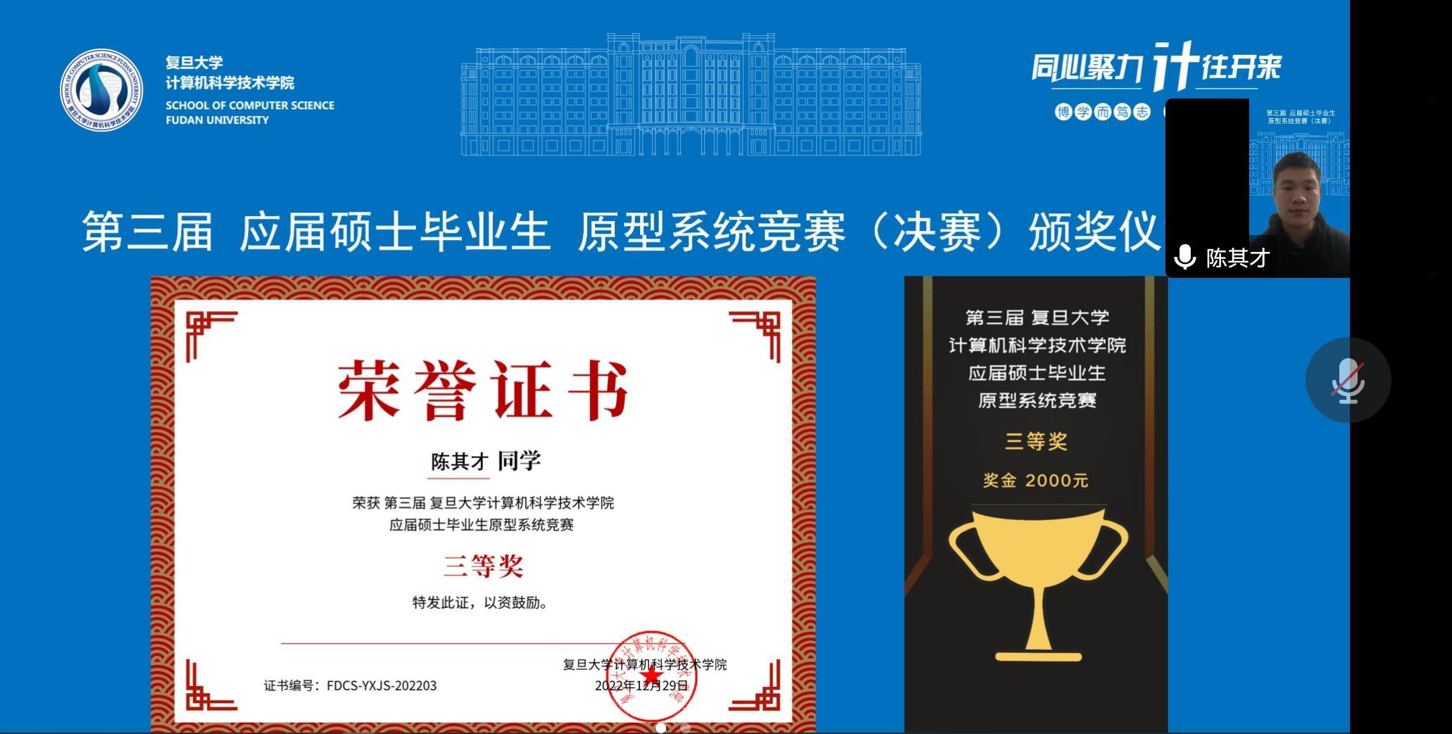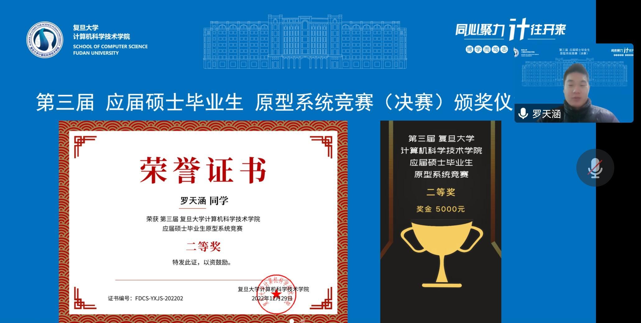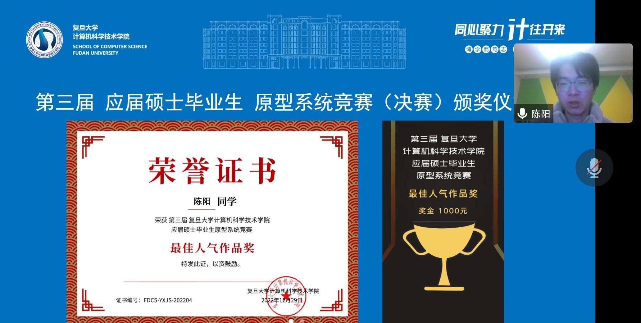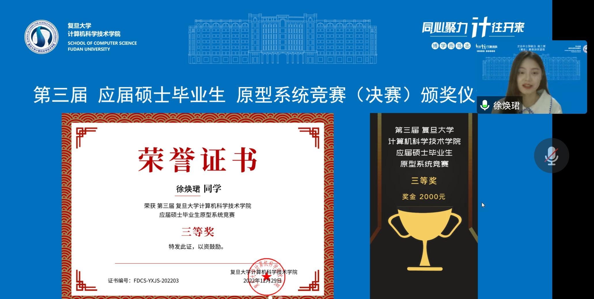12月29日下午,计算机科学技术学院主办的第三届应届硕士毕业生原型系统竞赛决赛以线上会议的方式成功举行。本次比赛针对2022年秋季学期的应届硕士毕业生,参赛作品为硕士学位论文内容所对应的系统实现,包括软件工具、软件系统、硬件装置、软硬件混合系统等。该项比赛的主要目的是鼓励和激发硕士研究生围绕自身研究方向深入钻研技术,潜心开展系统研发,形成有价值的研究成果。