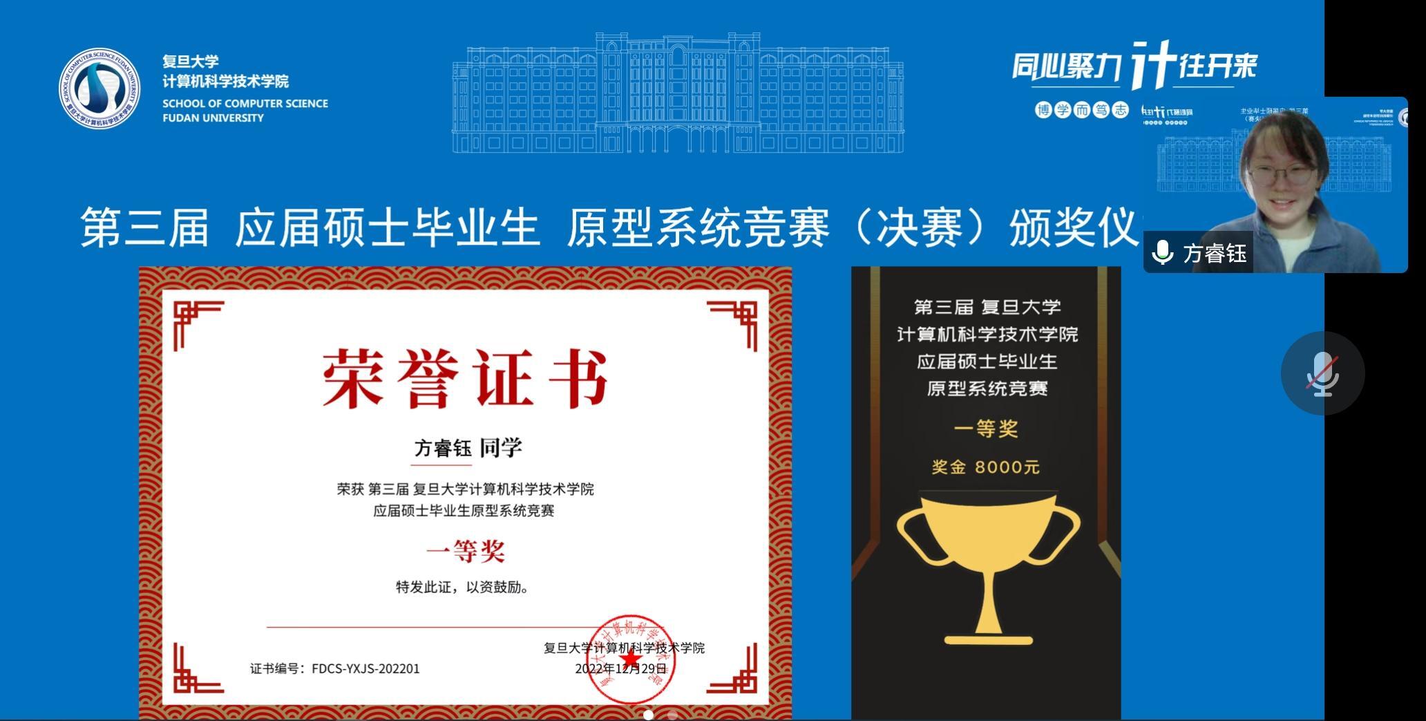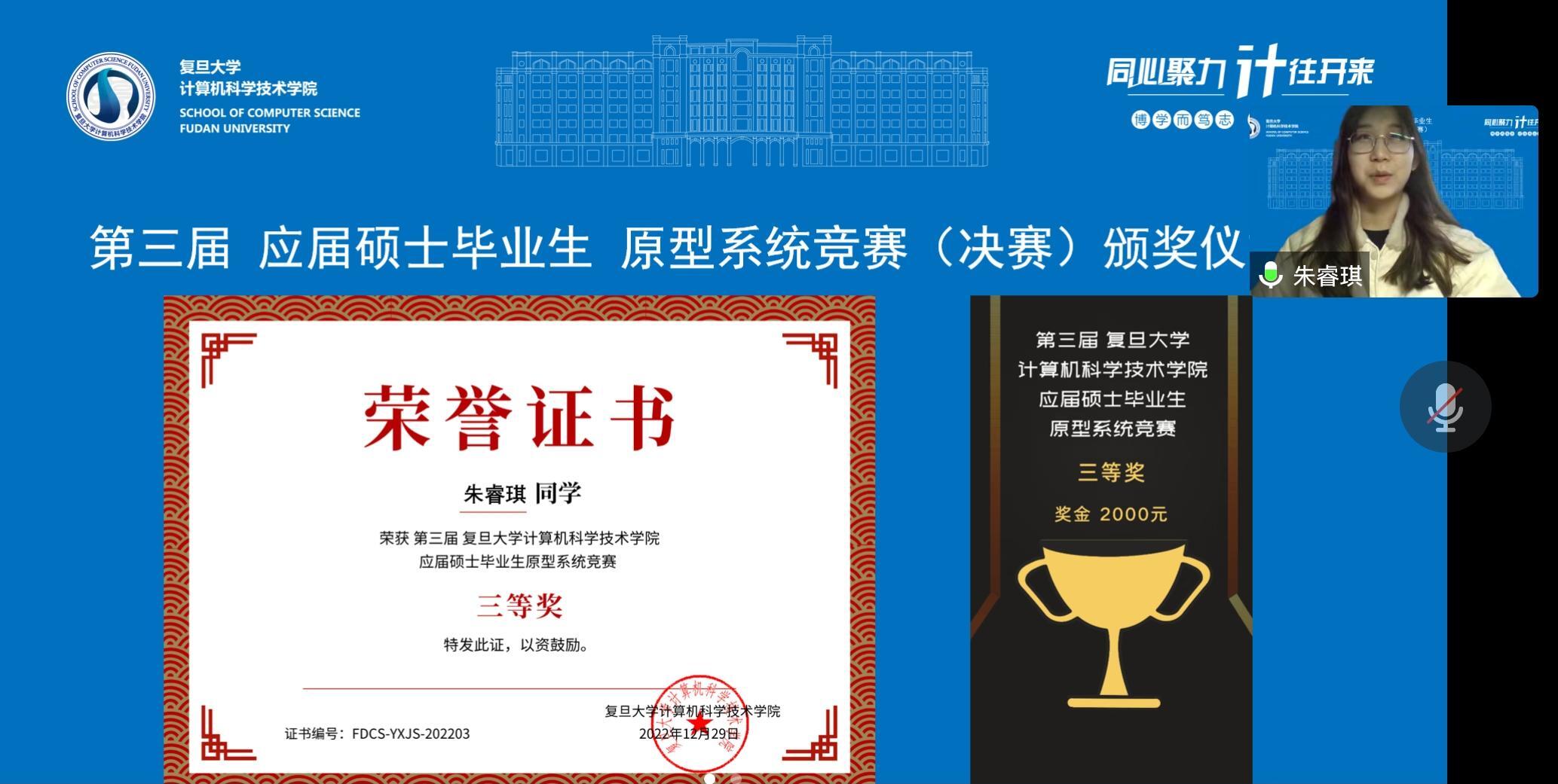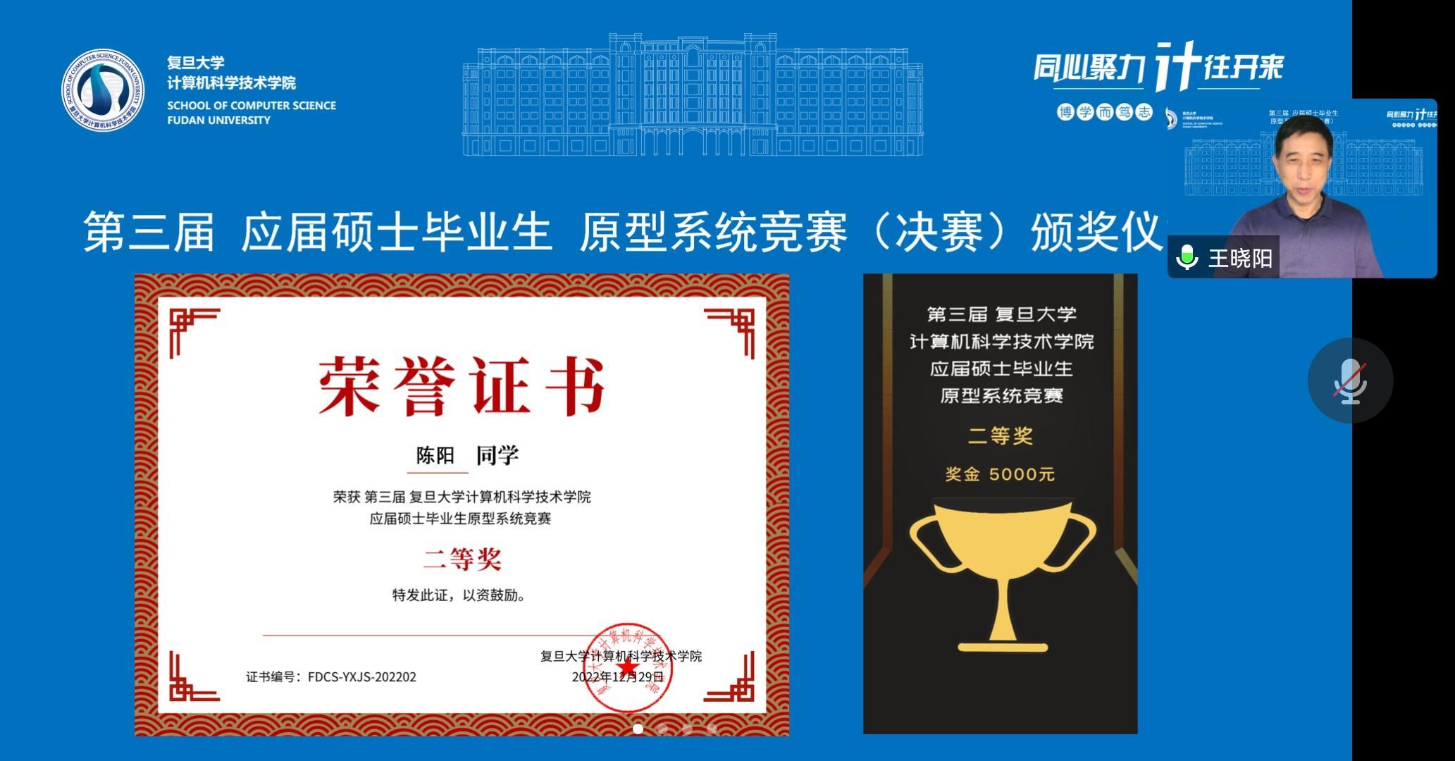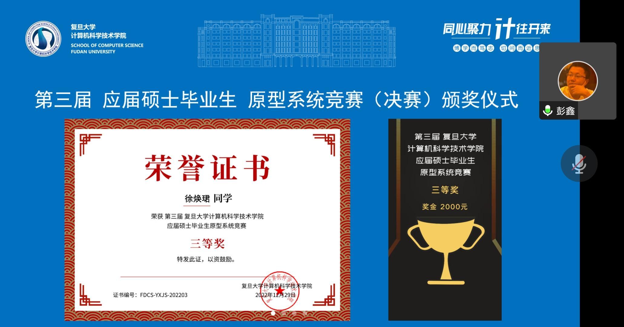12月29日下午,计算机科学技术学院主办的第三届应届硕士毕业生原型系统竞赛决赛以线上会议的方式成功举行。本次比赛针对2022年秋季学期的应届硕士毕业生,参赛作品为硕士学位论文内容所对应的系统实现,包括软件工具、软件系统、硬件装置、软硬件混合系统等。该项比赛的主要目的是鼓励和激发硕士研究生围绕自身研究方向深入钻研技术,潜心开展系统研发,形成有价值的研究成果。