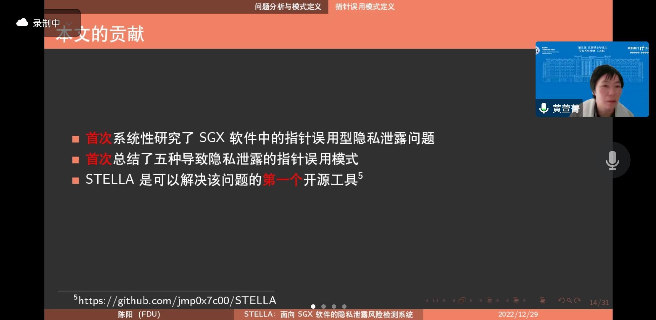 二等奖获得者陈阳同学(导师:徐辉)的作品《STELLA: 面向SGX软件的隐私泄露风险检测系统》首先定义了 SGX 软件中常见的五种指针误用导致隐私泄露的错误编码模式,然后实现了基于稀疏污点静态分析去检测这些模式。此外,该作品还以518票的最高投票数获得本次最佳人气作品奖。