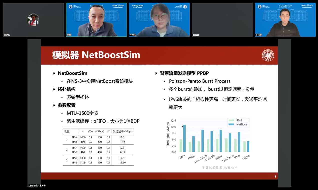 一等奖获得者方睿钰同学(导师:陈阳)的作品《基于IVI双重翻译技术的端到端连接加速系统》提出NetBoost系统解决IPv6部署困境,利用双重翻译技术将IPv4端到端流量转移到IPv6网络进行传输,NetBoost在CERNET2上的部署可有效提高吞吐率与文件下载速度。