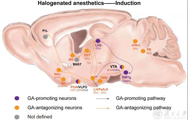 图一、卤代类吸入麻醉药全身麻醉诱导调控中,外侧缰核(LHb)谷氨酸能神经元和吻内侧被盖核(RMTg)γ-氨基丁酸能神经元促进麻醉诱导;伏隔核(NAc)多巴胺D1受体阳性神经元、丘脑室旁核(PVT)谷氨酸能神经元等抑制诱导;而中脑腹侧被盖区(VTA)和下丘脑视前区(POA)则因神经元类型和亚区的差异,发挥促进和抑制诱导的双重调控作用。