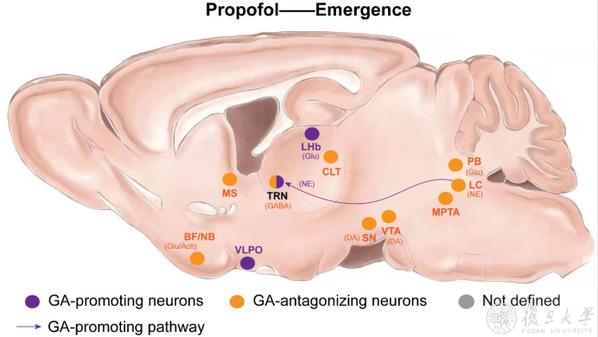 图二、丙泊酚全身麻醉苏醒调控中,外侧缰核(LHb)谷氨酸能神经元和下丘脑腹外侧视前区(VLPO)抑制苏醒;臂旁核(PB)谷氨酸能神经元、基底前脑(BF)胆碱能神经元等促进苏醒;而丘脑网状核(TRN)则起促进和抑制苏醒的双重调控作用。