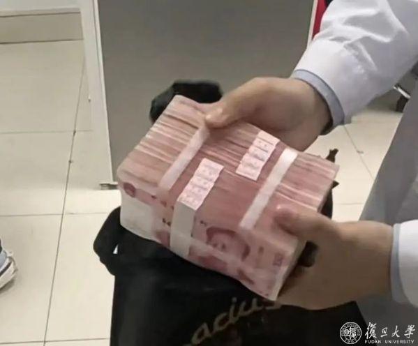 近日,复旦大学附属华山医院挂号收费窗口,一位戴着帽子、墨镜的爷叔扔下一个黑色的袋子后,转身就“逃”。工作人员打开一看,竟然是10万元人民币。