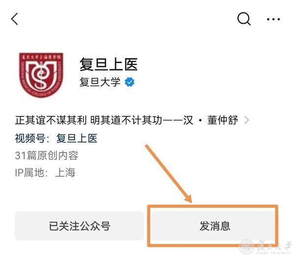 ①关注“复旦上医”公众号并点击“发消息”进入对话界面