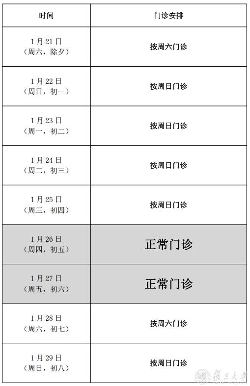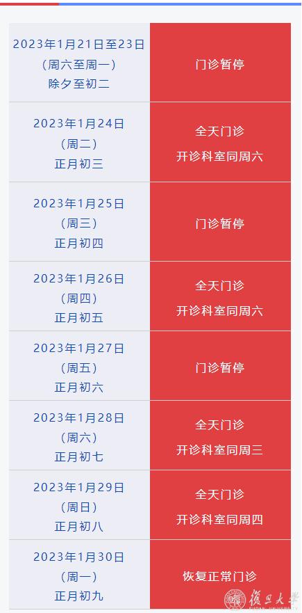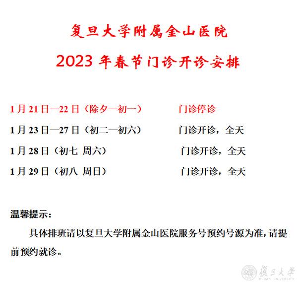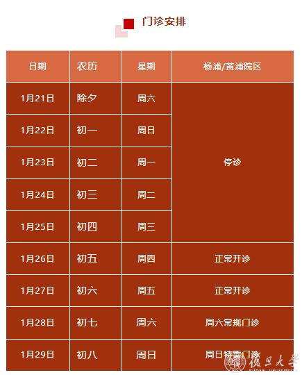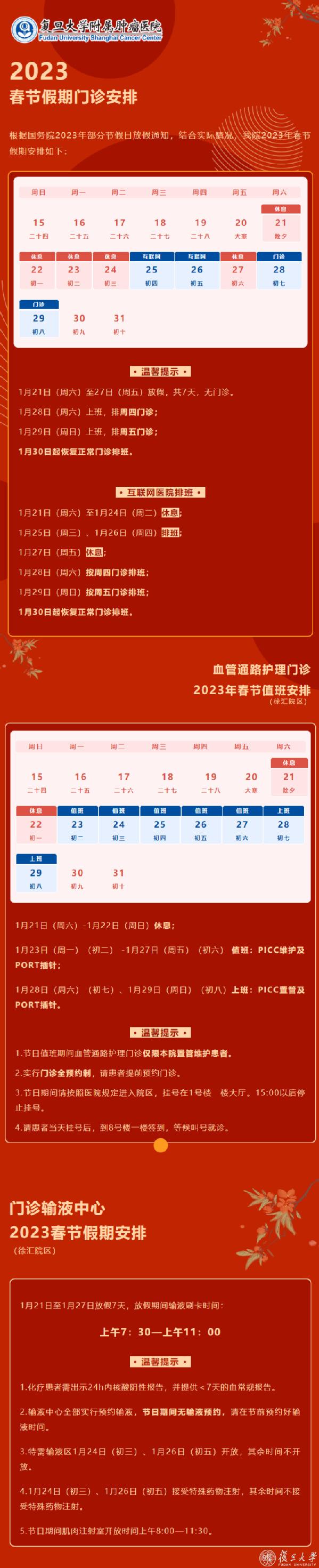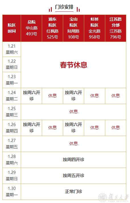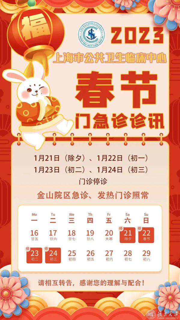 2023年春节期间,复旦大学附属上海市第五人民医院门诊安排如下: