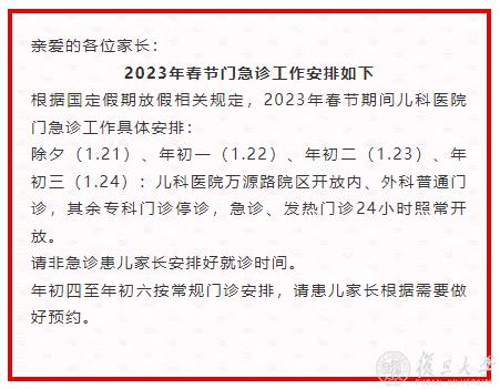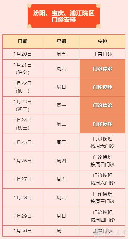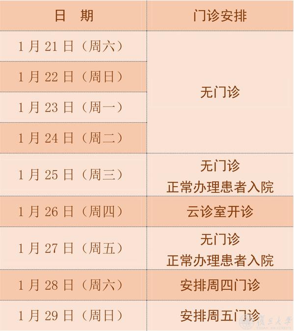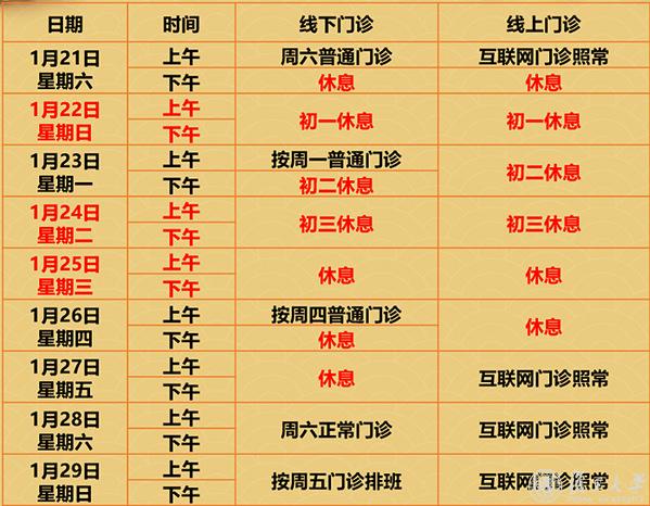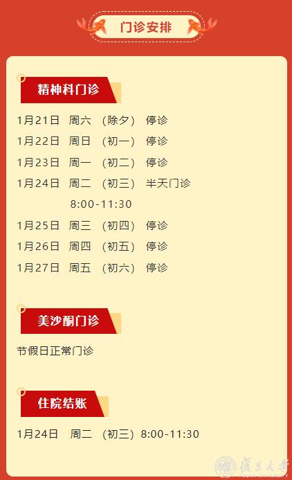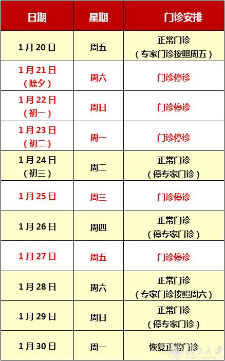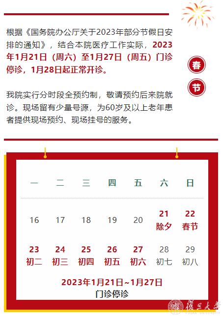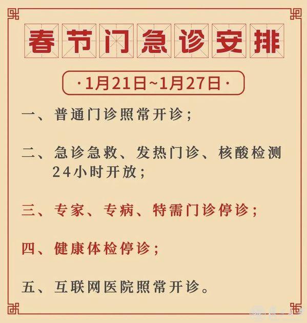 1月21日(除夕 周六)至1月23日(初二 周一),门诊停诊。