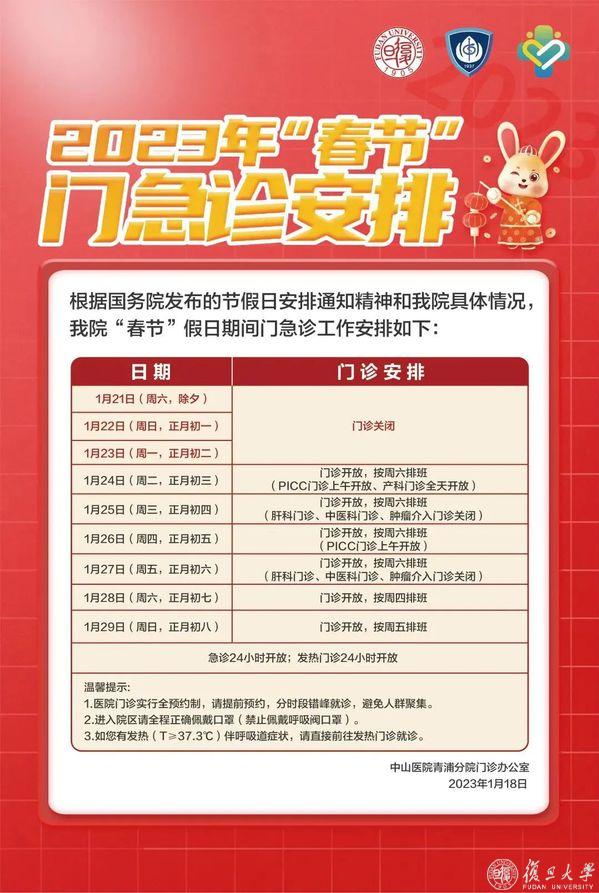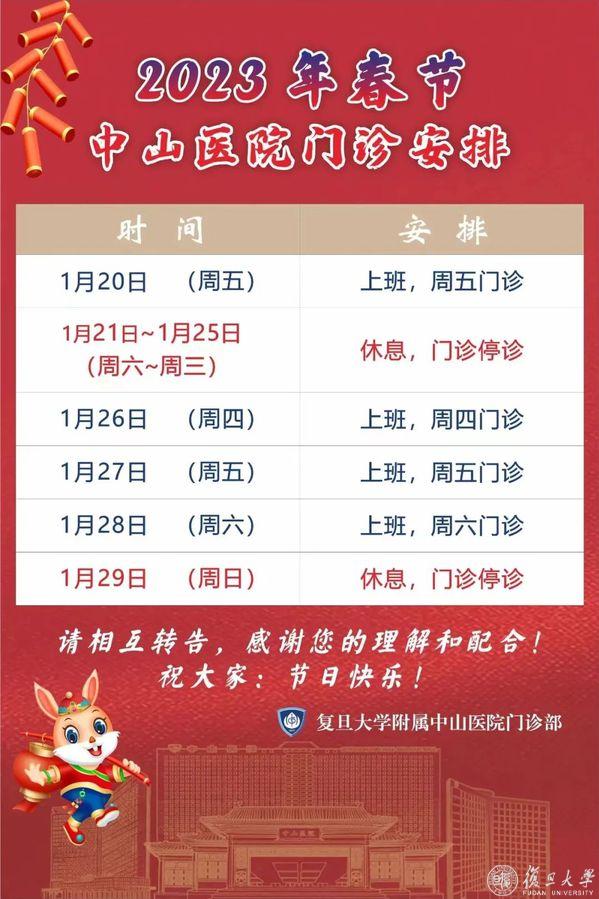复旦大学附属中山医院徐汇医院2023年春节门诊安排