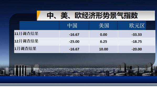 民间消费景气指数为26.67,与上期相比增加约2个点;民间投资指数为13.33,与上期相比增加约1个点;政府支出指数为70.00,与上期相比增加约4个点;国内债务指数76.67,与上期相比增加约5个点;国际债务指数为36.67,与上期相比增加约2个点;就业率景气指数与12月份调查结果相比增加约8个点;汽车登记率增加约8个点;世界贸易份额景气指数减少约12个点。