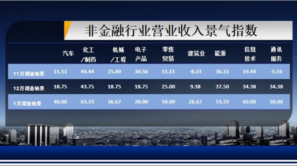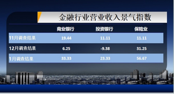 本期发布的金融行业指数与12月调查结果相比,专家上调商业银行、投资银行和保险业的景气预期。