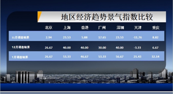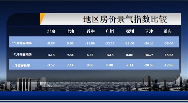 与12月调查结果相比,除北京外,调查对象各地区经济景气指数均出现上调。1月最高经济景气指数为深圳,为56.67;天津经济景气指数最低,为21.43。其次,从房价景气指数来看,与12月调查相比,调查对象城市的房价景气指数均出现下调。本期调查中,天津的房价景气指数最低,为-28.57。