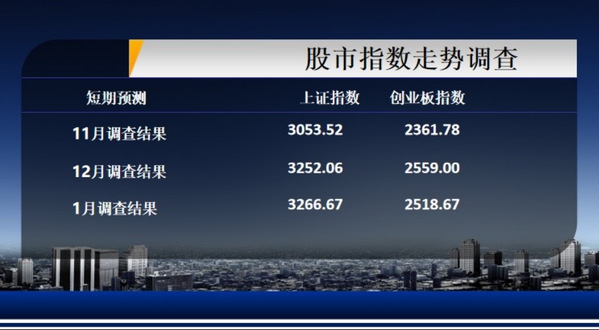 本期调查时的上证综合指数基准为3176.34,专家预测3个月后的预测平均值上升约90点,1年后的预测平均值上升约310个点;本期调查时的恒生指数为21534.43,3个月后的预测平均值上升约556个点,1年后的预测上升约3052个点。本期调查时的创业板指数为2473.81,3个月的预测上升约45点,1年后的预测上升约234个点。本期调查时科创50指数为972.26,3个月的预测上升约32个点,1年后的预测上升约96个点。WTI原油价格短期调查基准值为78.13美元/桶,3个月后价格预期下调0.53美元。