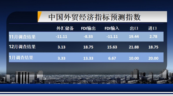 23年1月外汇储备预测指数为3.33,与上期数据相比增加0.2个点;FDI输出预测指数与12月份相比减少约5个点;FDI输入预测指数与12月份相比减少约9个点;出口预测指数与上月相比减少12个点;进口预测指数与上期相比增加约1个点。