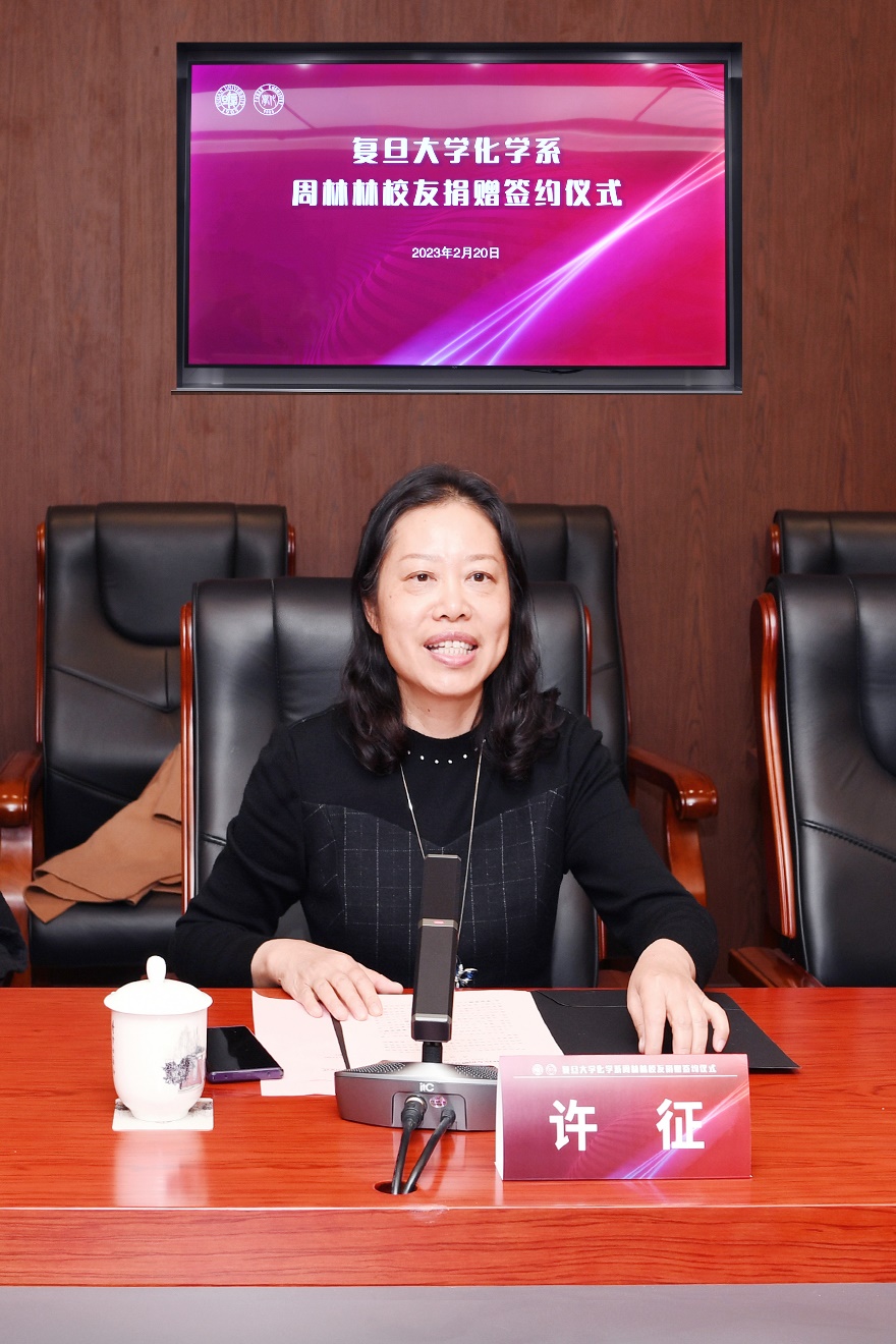 许征代表复旦大学对周林林校友心系母校、慷慨捐赠助力复旦大学教育事业发展的义举表示衷心感谢。她详细介绍了母校建设“第一个复旦”的情况及接下来的发展规划。她表示,此次捐赠饱含了周林林校友对化学系发展的期盼,更是对化学系追求卓越、矢志一流学科建设的大力支持和鼓励,为化学系的事业发展注入了蓬勃动力,也为其他校友树立了榜样,相信周林林校友的善举将汇聚更多对母校及教育事业充满热忱的校友和社会各界力量,成为建设“第一个复旦”的强大助力。希望化学系用心利用好此笔爱心捐赠,进一步提高师资力量、学科建设和人才培养等方面的水平,以更加昂扬的姿态为“双一流”建设做出应有的贡献。