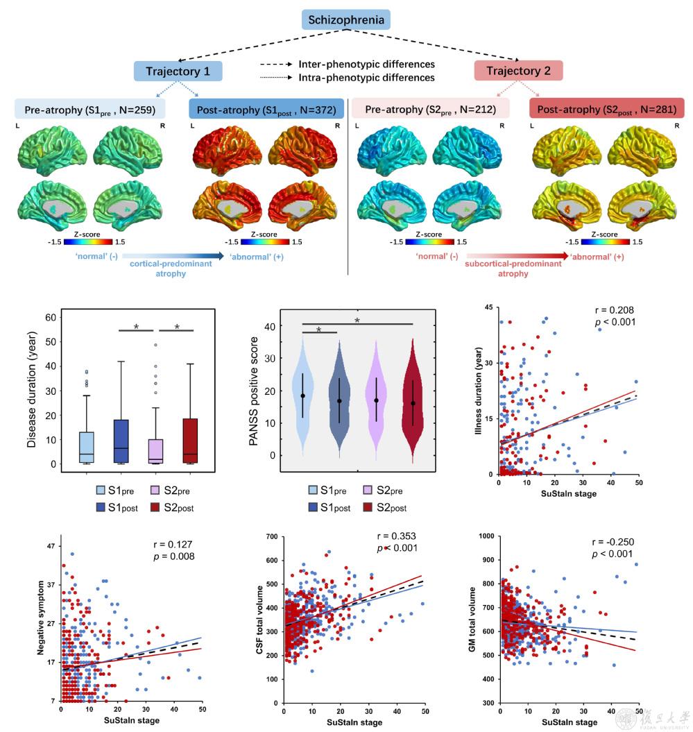 根据脑萎缩发展轨迹,对精神分裂症患者进行分型:首先,基于表型间差异(即表型异质性),所有精神分裂症患者根据两种发展轨迹被分为两种表型;然后,基于表型内差异(即时间异质性),每个表型内的患者个体根据其当前脑萎缩状态,(即属于“轨迹”中哪一阶段),被进一步划分为两个亚组(萎缩前期和萎缩后期)。通过解析表型异质性和时间异质性,定义了“语言区亚型:萎缩前期”(S1pre, n=259)、“语言区亚型:萎缩后期”(S1post, n=372)、“海马亚型:萎缩前期”(S2pre, n=212)、“海马亚型:萎缩后期”(S2post, n=281)四个亚组。亚型间在疾病病程、阳性症状、大脑结构等方面存在显著差异。