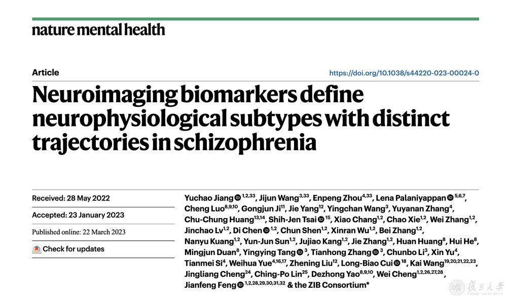 当地时间3月22日,成果以《神经影像标志物定义精神分裂症中具有不同神经生理轨迹的亚型》(“Neuroimaging biomarkers define neurophysiological subtypes with distinct trajectories in schizophrenia”)为题发表于Nature子刊Nature Mental Health。