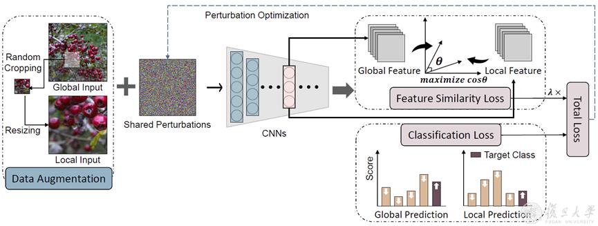 研究团队提出了一种基于自通用性增强的目标迁移攻击方法,使生成的扰动对一幅图像中的不同局部区域都具有通用性,通过引入特征相似性来最大化对抗全局图像和对抗随机裁剪局部区域之间的特征相似性来鼓励生成具有自通用性的对抗扰动,进而提升对抗样本的目标迁移能力。
