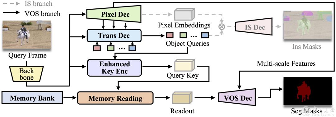 研究团队将实例理解显式地引入基于记忆网络的方法,提出一个双分支VOS网络。此外,该方法使用多路径融合模块,有效地结合记忆内容和来自实例分割解码器的多尺度特征。