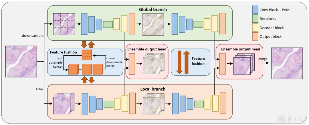 研究团队提出了一种基于全局-局部特征融合的虚拟重染色方法,设计了一个双分支生成对抗模型,分别接受缩小的全局图像和部分局部图像块作为输入,通过在编码器阶段的多次双向特征融合,大幅缓解了生成图像块之间的颜色、亮度、对比度等差异。同时,结合不同局部图像块的异步训练,解决了全切片病理图像的虚拟生成问题。