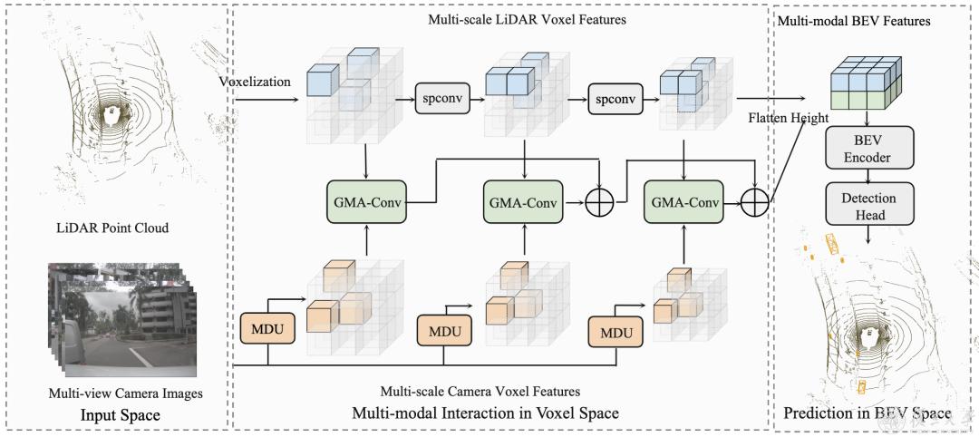 研究团队提出了一种新的框架实现多传感器信息融合,通过深度感知设计的多深度投影策略来增强每个种子点的深度质量;应用门控模态感知卷积模块以细粒度的方式调节前一步中投影得到的相机体素,然后将多模态特征聚合到一个统一的空间中,共同为检测头提供了更全面的多模特征。