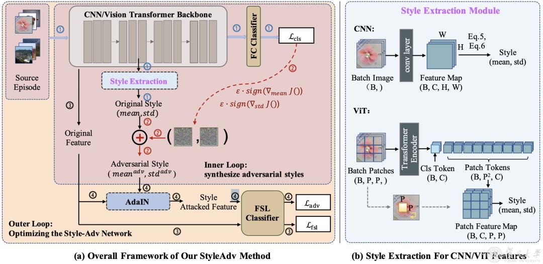 研究团队受到对抗攻击的启发,创新性地提出了一个元学习风格攻击算法,并基于该攻击算法提出了一个与模型无关的风格对抗训练跨域小样本学习方法StyleAdv。通过不断迭代进行风格攻击与模型训练,用于训练的跨域小样本学习模型将逐步对不同风格图像数据拥有识别能力,从而提升模型在未知目标域数据集上的性能表现。