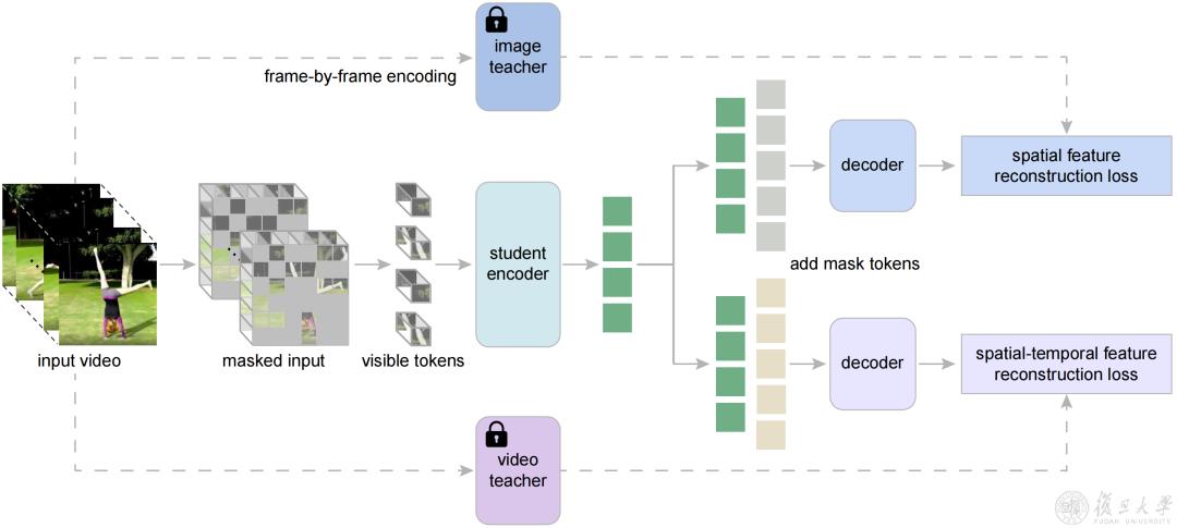 研究团队提出了掩码视频蒸馏 (MVD),通过恢复掩码位置的低级特征来预训练图像(或视频)模型,然后使用训练好的模型所提取的高级特征作为掩码特征建模的目标。为了利用不同教师模型的优势,研究团队为MVD设计了一种时空协同教学方法——让学生模型同时学习重建图像教师模型和视频教师模型提供的目标特征。