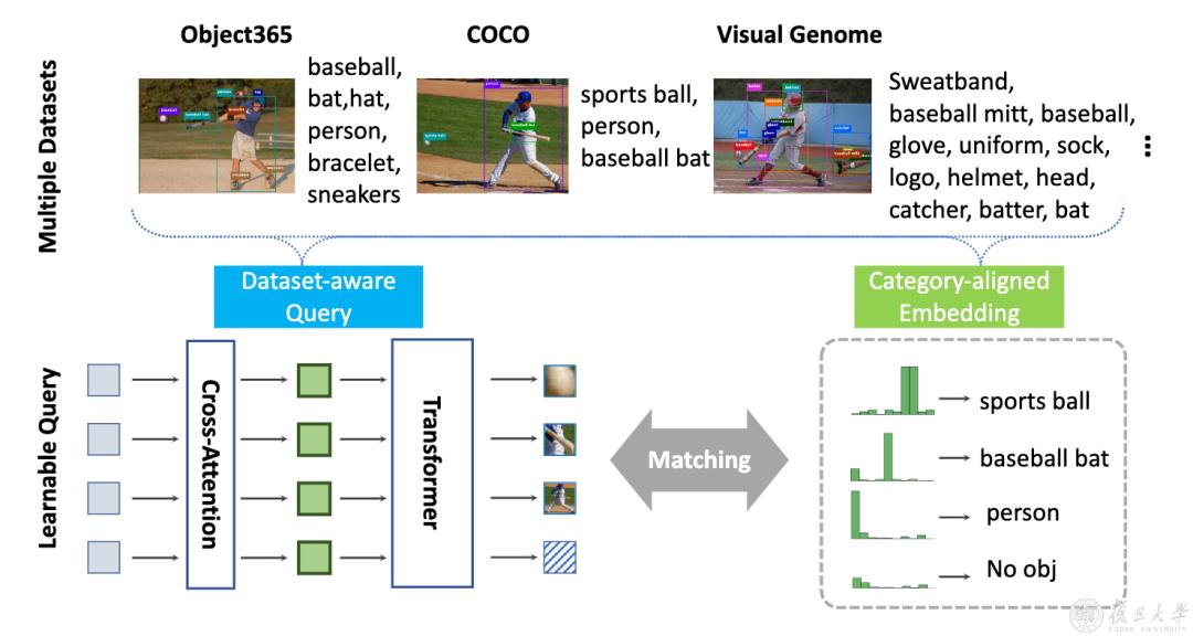 研究团队提出了一种检测枢纽,引入数据集嵌入向量来实现数据集感知、将不同数据集中的类别根据语义信息进行对齐。这个方法不仅解决了多数据训练中的不一致问题,而且为检测器提供了来自不同数据集的连贯监督。