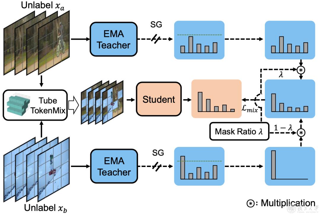 研究团队研究了在半监督设置下使用Transformer模型进行动作识别,并提出SVFormer方法。该方法采用稳定的伪标注框架(即EMA教师)来处理未标记的视频样本。研究团队引入了一种新的数据增强策略Tube TokenMix,该策略专为视频数据而设计。此外,研究团队提出了一种时间扭曲增强来覆盖视频中的复杂时间变化。