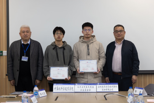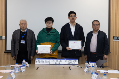 随后,孙涛副总裁和王新书记为获奖学生颁奖。博士生徐际岚代表获奖学生发言,汇报了自己的学习科研近况和取得的成果。他的研究聚焦于研究多模态(主要集中在计算机视觉和自然语言处理)方向以及医学影像领域的研究,在相关领域的国际会议上发表多篇论文。他对于启明星辰在我院设立奖学金深表感谢,表示以获得启明星辰奖学金作为新的起点,踏实前行。