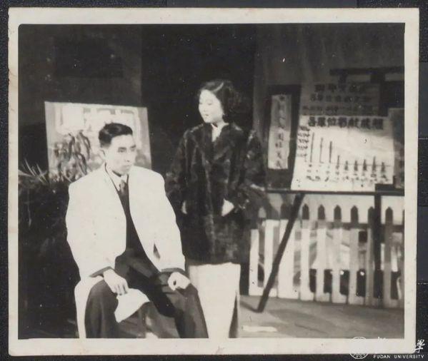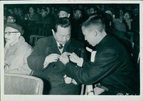 1959年在上海市府大礼堂沈自尹(右)为姜春华老师(左)佩戴奖章