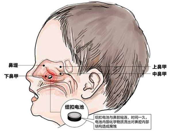 所以,一旦发现小儿将纽扣电池塞入鼻腔,要立即看急诊。