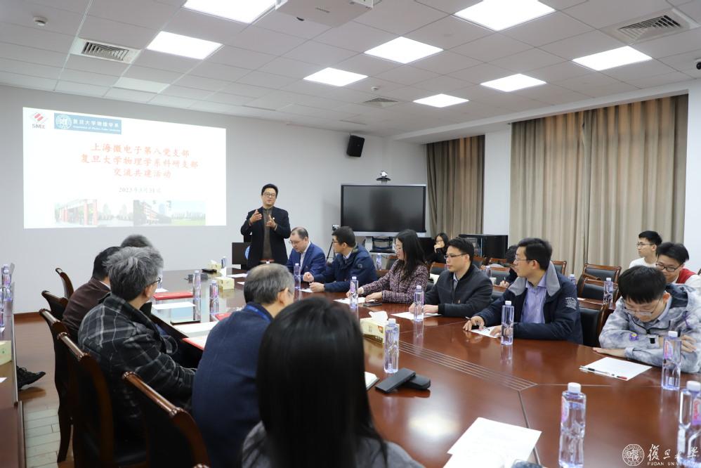 物理学系党委副书记、科研第一党支部书记石磊教授主持本次共建活动,向上海微电子同志介绍了物理学系党委及科研党支部情况,上海微电子第八党支部的孙文凤书记向大家介绍了上海微电子的发展历程以及支部概况。物理学系党委刘召伟书记介绍了推动校企党建共建的目标与设想,希望通过搭建校企党建交流的平台,推动自由探索、基础研究与有组织科研创新相结合,帮助校企党员立足岗位发挥作用、更好成长,在服务高质量人才培养、高水平科技创新策源进程中,携手服务上海科创城市建设、更好对接国家重大战略需求。