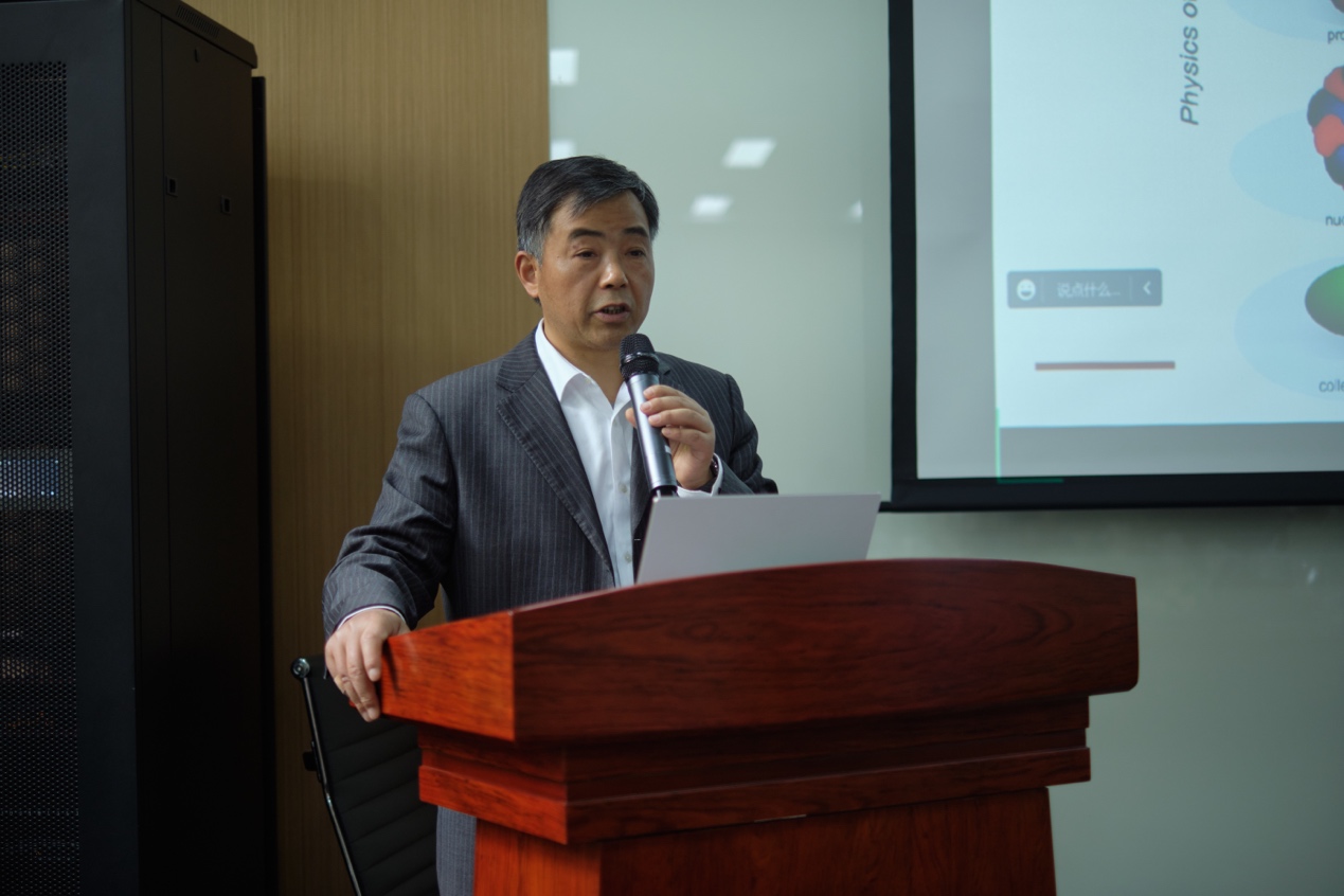 董国轩代表国家基金委数理学部致辞,希望上海核物理理论研究中心聚焦世界核科学前沿和国家重大需求,通过支持高端和前沿的理论物理研究,组织以上海为中心的华东地区优秀的理论物理研究力量,交叉协作产生一流的创新成果,力争打造我国理论物理学界高层次的学术交流中心。