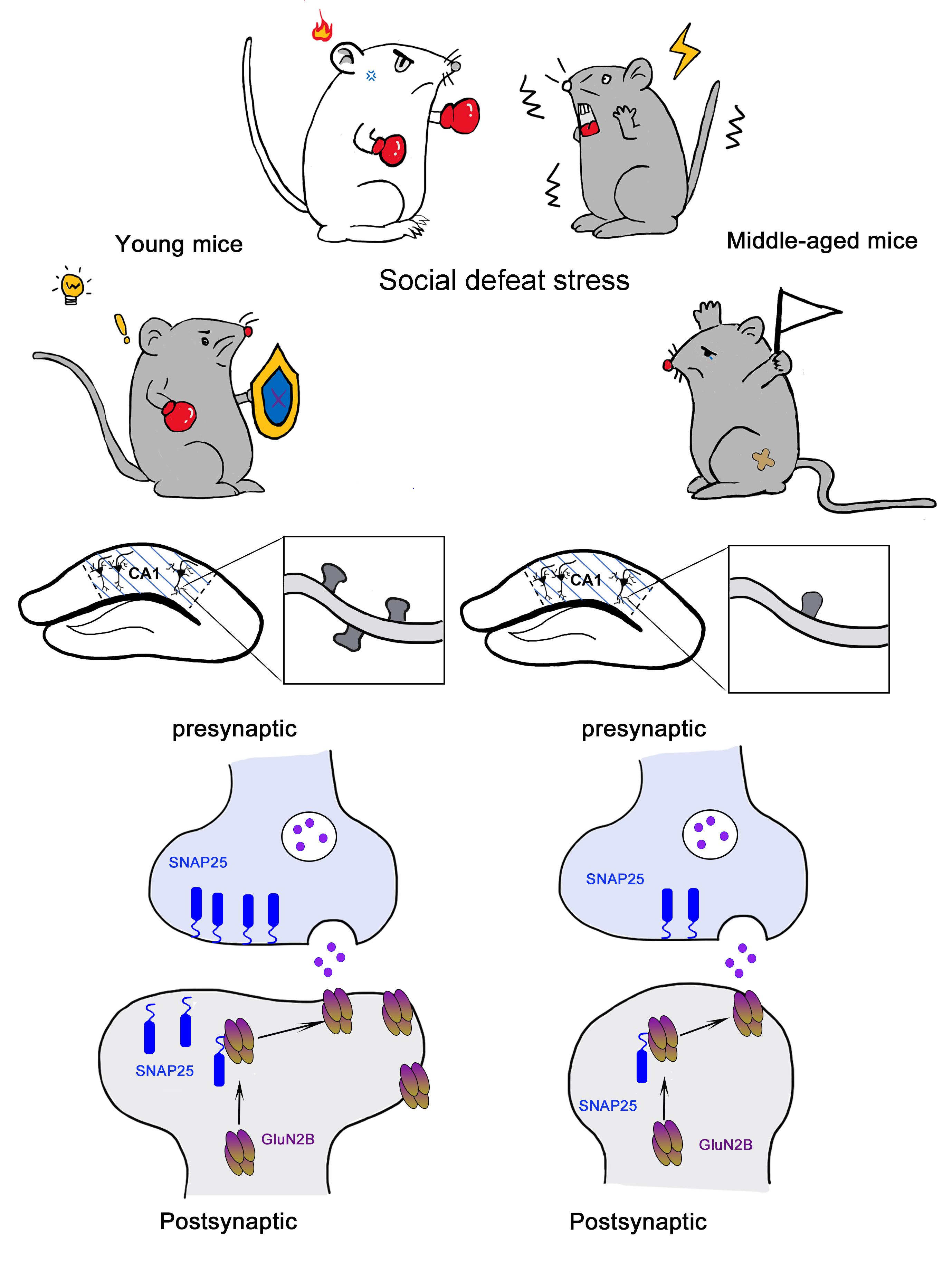 研究者将一只雄性C57BL/6小鼠(受试鼠)放入一只陌生的CD-1雄性退役种鼠领地,后者将对受试鼠发动攻击,攻击持续约5分钟(中等强度应激),然后将两只小鼠隔开,彼此间仍能互视、互听、互嗅但无法进行身体接触。这一过程重复10天,但每一天受试鼠与攻击鼠都是陌生的,即受试鼠连续10天被不同的CD-1小鼠攻击5分钟,震慑24小时。该动物模型常用于模拟人类社会强势对弱势个体施加的精神压力。经历该社交挫败的受试小鼠常出现社交回避、焦虑甚至抑郁样行为。在本研究工作中,研究者们发现,该强度的社交挫败明显增强受试小鼠的新物体识别、恐惧和空间学习记忆能力。有趣的是,这一结果仅出现在年轻的受试小鼠(6-8周龄),而中年受试鼠(8-11月龄)在经历同样强度的社交挫败后未能观察到学习记忆能力的改变。研究人员进一步发现,社交挫败引起的学习记忆能力增强并不依赖于小鼠的社交回避和焦虑样行为。因为改善社交挫败导致的社交回避和焦虑样行为并不影响年轻小鼠的学习记忆能力增强,且这种能力的增强在社交挫败结束后2周依然存在。同时值得注意的是,只有年轻受试鼠的背海马CA1区锥体神经元树突棘密度、突触蛋白SNAP-25和NMDA受体GluN2B亚型表达水平显著上调,而中年受试鼠的这些变化不显著。这一神经可塑性改变与小鼠的行为表型相一致。此外,化学遗传学抑制海马CA1区CaMK2A阳性的兴奋性锥体神经元、或是选择性敲减此类神经元内的SNAP-25和阻断GluN2B受体,均可取消社交挫败导致的学习记忆能力增强。