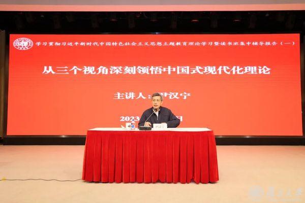 4月20日上午,复旦大学学习贯彻习近平新时代中国特色社会主义思想主题教育理论学习暨读书班集中辅导报告会在光华楼举行。马克思主义理论研究和建设工程咨询委员会委员尹汉宁作主题为“从三个视角深刻领悟中国式现代化理论”的专题辅导报告。校党委副书记、纪委书记金海燕主持报告会。