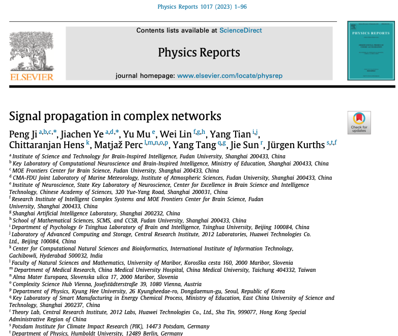 复旦大学类脑智能科学与技术研究院纪鹏研究员联合中国科学院脑科学与智能技术卓越创新中心穆宇研究员、华东理工大学唐漾教授、华为公司孙杰研究员、复旦大学Jurgen Kurths特聘教授等,综述了复杂网络中信号传播的理论研究进展和其在多个领域的应用。近日,相关成果以《复杂网络中的信号传播》(“Signal propagation in complex networks”)为题在《物理报道》(Physics Reports)杂志上发表。