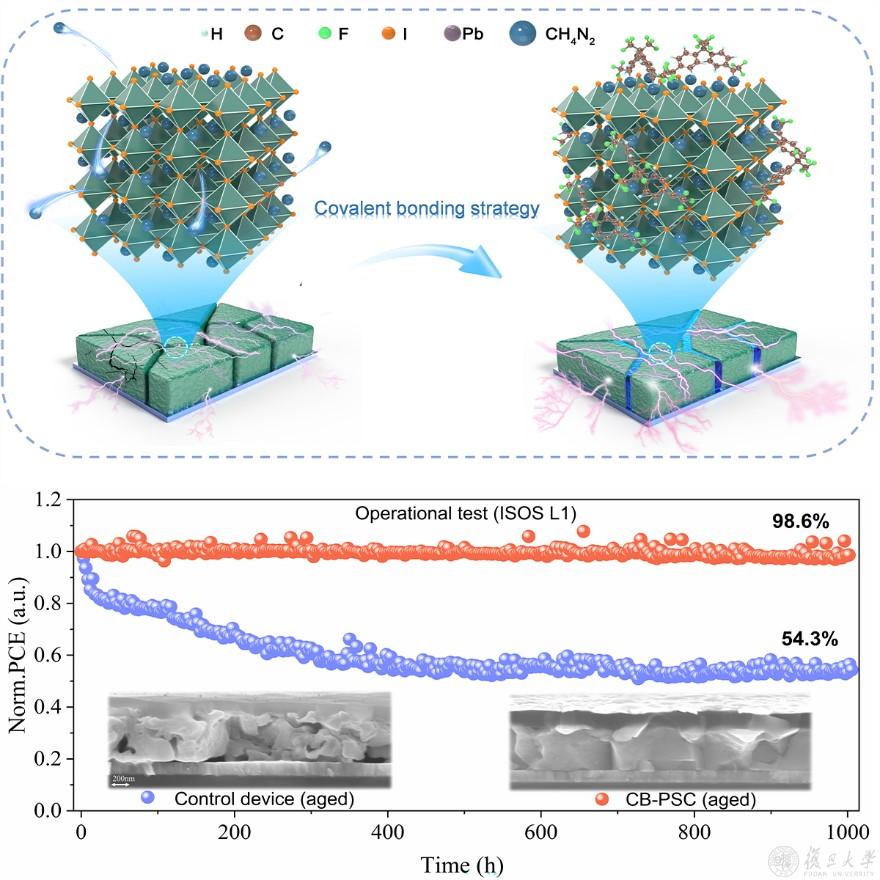 近日,信息科学与工程学院詹义强、蔚安然教授团队与加拿大维多利亚大学Jeremy教授团队合作首次提出共价键合的策略稳定钙钛矿有机组分,成功实现了高效稳定的钙钛矿太阳能电池。该成果以“Covalent bonding strategy to enable non-volatile organic cation perovskite for highly stable and efficient solar cells”为题发表于Joule期刊。