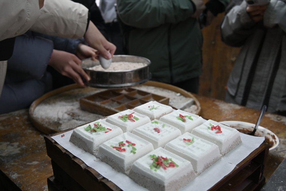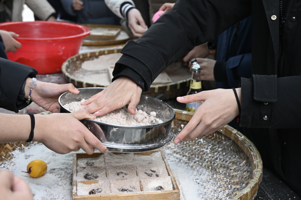 2021级金融保险班的同学们制作并品尝了罗泾镇特色小吃:四喜风糕。筛粉、蒸糕、出炉,热乎乎的蒸糕,枣与坚果的香气交织着糯米的清甜,令人忍不住多吃一块。“我们从筛糕粉这一步做起,将糕粉以及其他原材料放入容器铺好、放入蒸箱进行蒸制。看似不难,却要记住众多小诀窍才能使成品松软可口。作为一个上海人,七宝方糕、崇明糕自是家里常吃的,宝山的风糕倒是吃的不多。这次品尝到自己亲手制作的四喜风糕,可谓是双倍快乐。”2021级金融学系的王诚瑞说道。