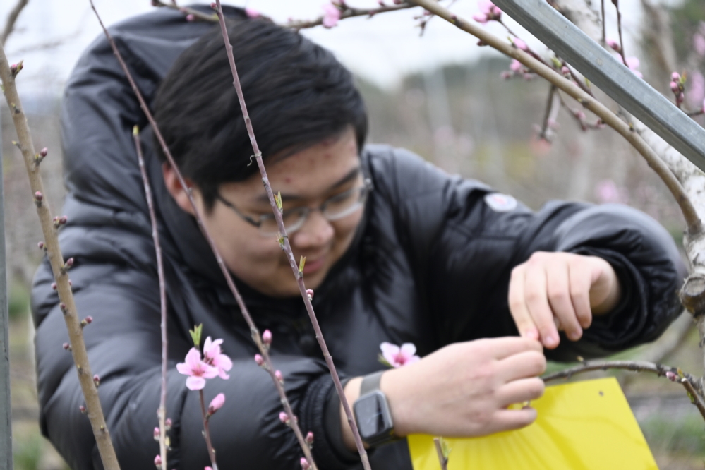 2021级UIPE班进行劳动实践,为黄桃树挂粘虫板、迷向丝
