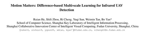 本届挑战赛共吸引了来自国内外的52支队伍参赛,经过一个多月的激烈角逐,由颜波和谭伟敏带领的复旦大学数字媒体实验室团队凭借提出的基于差异的多尺度无人机检测学习方法,在无人机检测及跟踪赛道(Track 2)取得了第二名的成绩,在无人机跟踪赛道(Track 1)取得了第四名的成绩。相关论文“Motion Matters: Difference-based Multi-scale Learning for Infrared UAV Detection”已被CVPRW 2023接收。