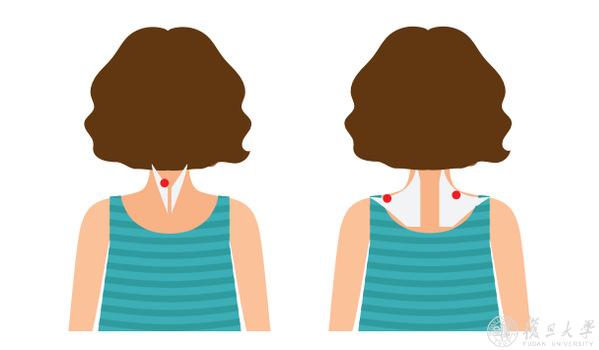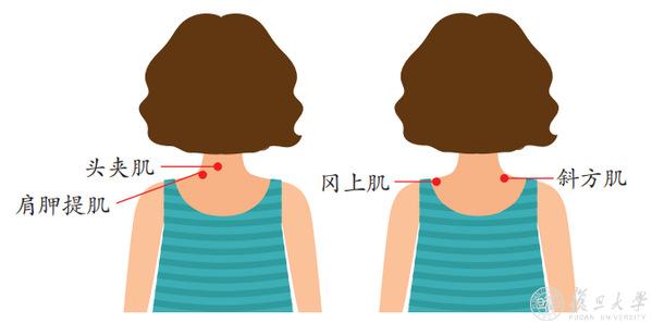 双手食指及中指放于后脑勺下方头颈连接处,可触摸到两条斜纵向肌肉,即头夹肌,颈部略微后仰放松,指腹适度用力沿肌肉按摩30秒;将左手放于右肩中部(斜方肌止点处)附近,指腹适度用力按摩30秒,放松右侧斜方肌;然后将右手放于左肩中部,同样方式按摩30秒(见图2)。