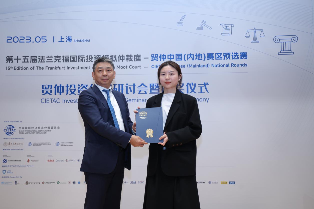 上海市律师协会会长季诺先生为决赛阶段最佳辩手、半决赛阶段最佳辩手于昀可同学颁奖