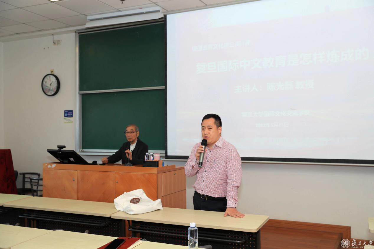 讲坛第一讲邀请了学院教授陈光磊主讲“复旦国际中文教育是怎样炼成的”。陈光磊师从陈望道先生,曾任中国修辞学会会长、《中国修辞》编委会主任,历任复旦大学国际文化交流学院汉语部主任、教学督导,复旦大学语言文字工作委员会委员,《修辞学习》主编。报告会由国际文化交流学院院长罗剑波主持,学院师生60余人参加。本次报告会也是学院学习贯彻习近平新时代中国特色社会主义思想主题教育专题党课。