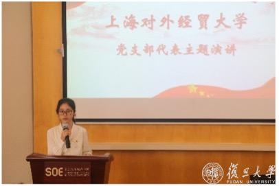 上海对外经贸大学金融管理学院研究生第四党支部书记徐迪对支部开展的特色党建活动以及强化党建辐射引领作用成效两大方面进行了深入分享。