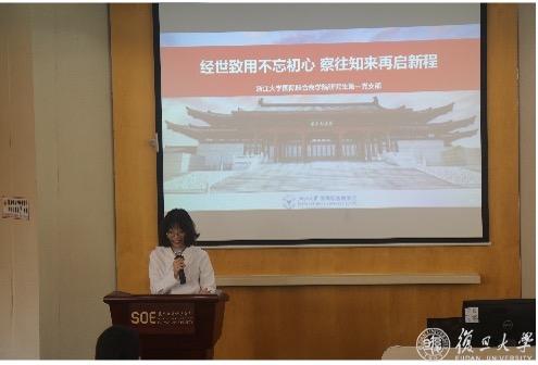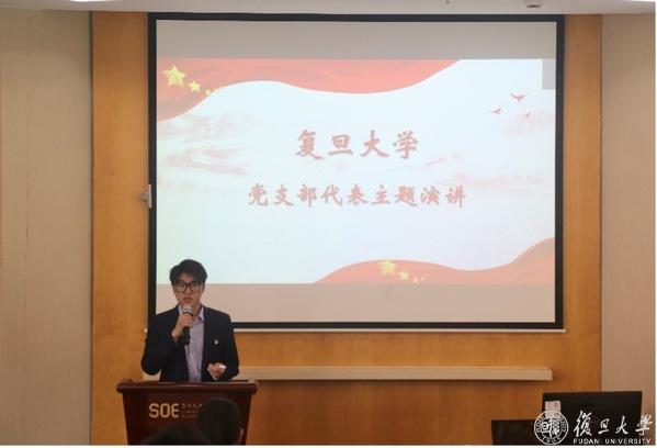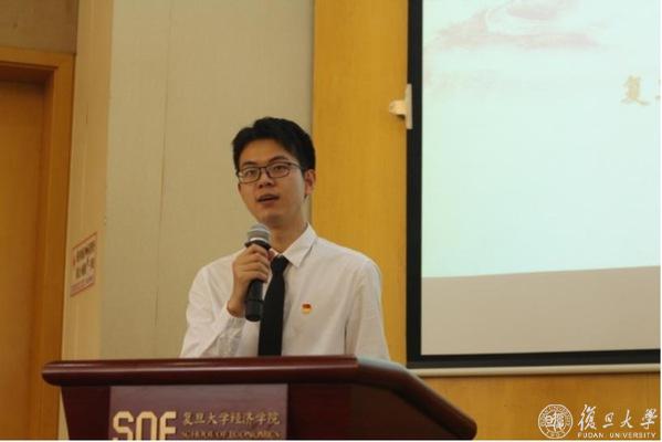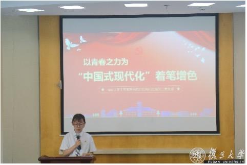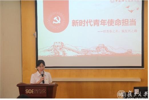 复旦大学经济学院2022级资产评估专硕党支部书记刘子源从复旦建校史和复旦青年运动史出发,号召大家学习青年运动,发扬“团结、服务、牺牲”的复旦精神,继承以天下为己任的情怀和责任意识。他表示,爱国与进步一直是复旦精神的主旋律,作为新时代的复旦青年,应该自觉向党组织靠拢,传承红色基因和精神底蕴。